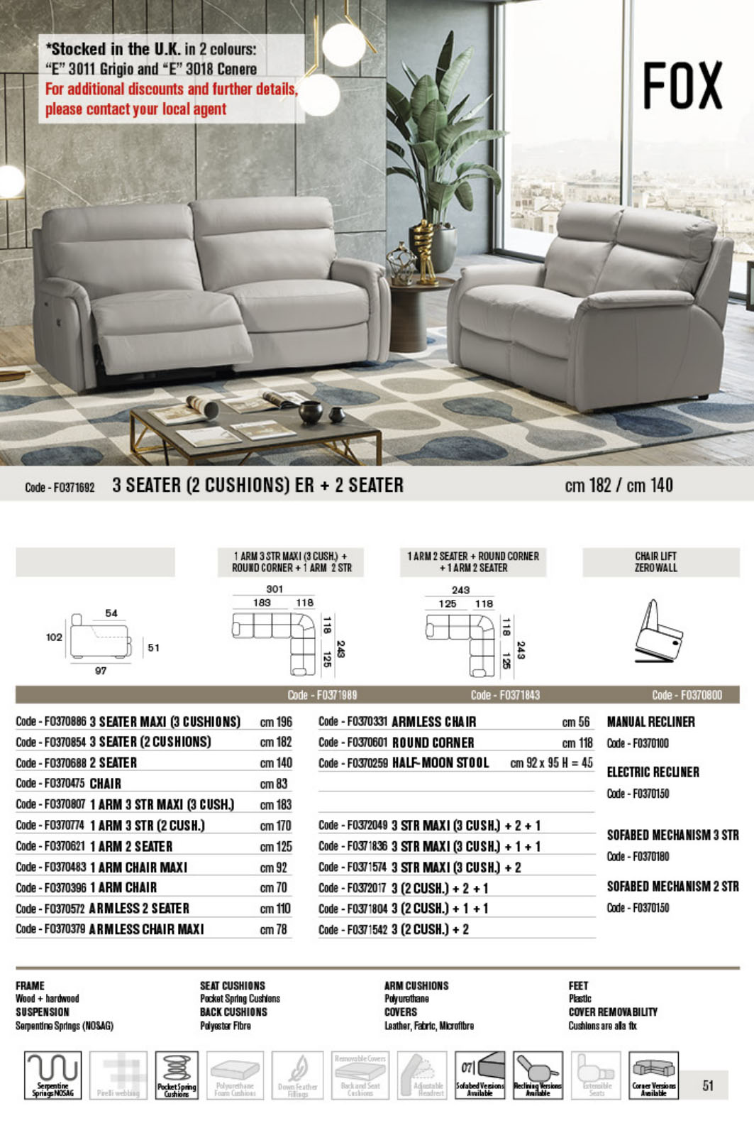 This sofa is available in leather or fabric, electric recliner ( +£300 per seat ) and MAXI options ( larger than standard ). Please contact us for more details.
