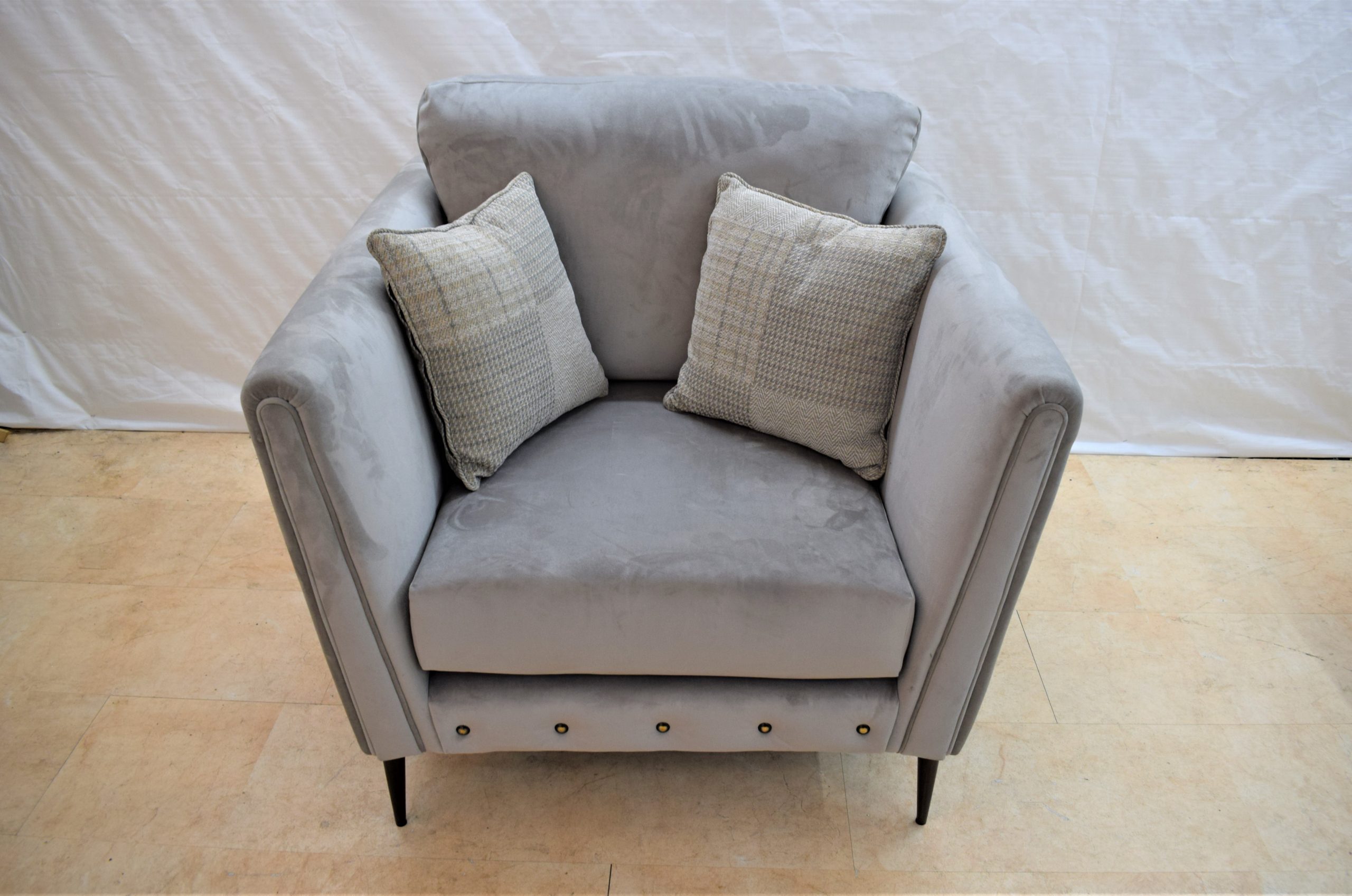 The Garda chair from our ex-display collection oozes sophistication and class. Made with a soft, velvety pale grey fabric and embellished with classy studs, add a touch of elegance to your home with the Garda.