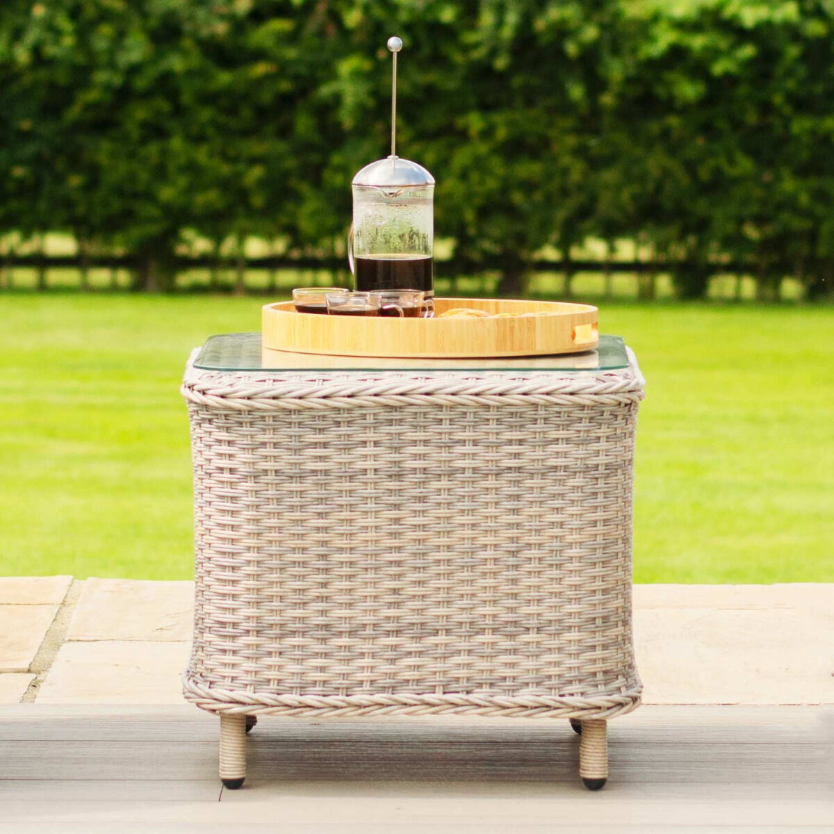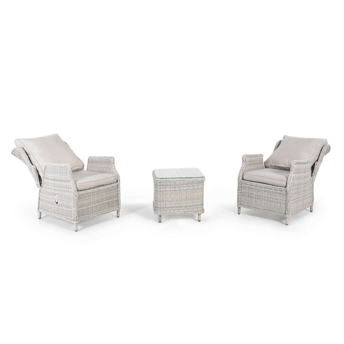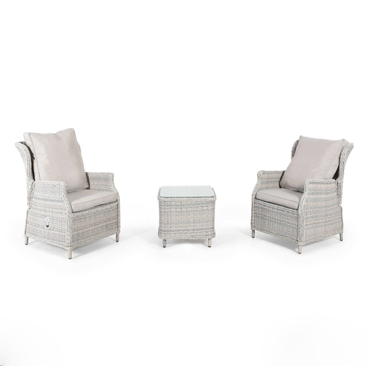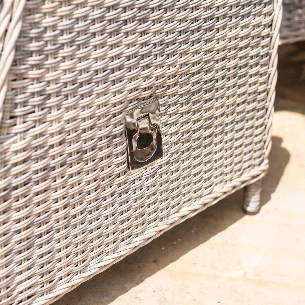 Recline and Relax in the HomeflairCotswold 2 seat reclining garden lounge Set. Our high back reclining rattan chairs are designed to hug you with extra comfort and back support thanks to beautiful, deep filled cushions. Crafted with a unique double ribbed weave which is a blend of caramel and stone tones giving it both a warm and cool look. If you love to relax in the garden or conservatory, this reclining rattan armchair set with side table by Maze Cotswold could be the perfect addition to your home.