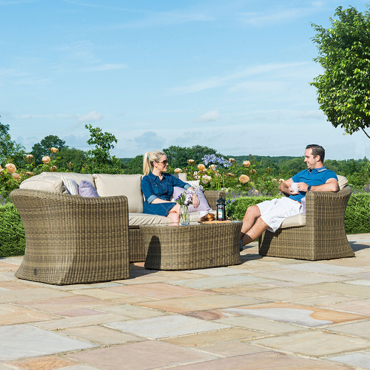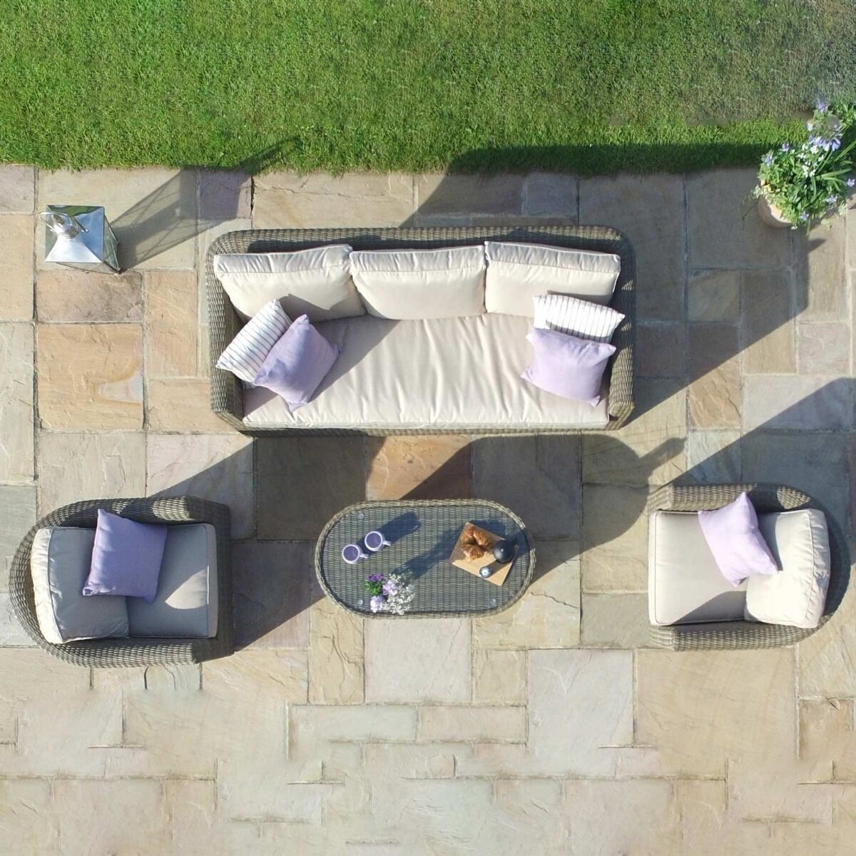 The Winchester 3 Seat Sofa Set includes a luxurious three seat sofa, combined with a matching pair of armchairs and large oval shaped coffee table. This set is recognised for the thick shaped arms and backs to the set. We recommend storing cushions inside overnight. As with all Homeflair products, it is made from the highest quality material, woven onto a powder coated aluminium frame that ensures its use all year.