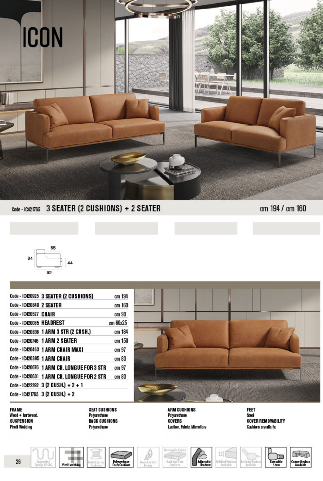 The Icon Leather Sofa from Newtrend Concepts Italia features full genuine leather upholstery with spring-encased-in-foam seat cushions to prevent sagging and an extremely solid hardwood frame. Featuring fold-down headrests for better head and neck support, the Icon provides excellent comfort whilst exuding elegance of the highest degree.