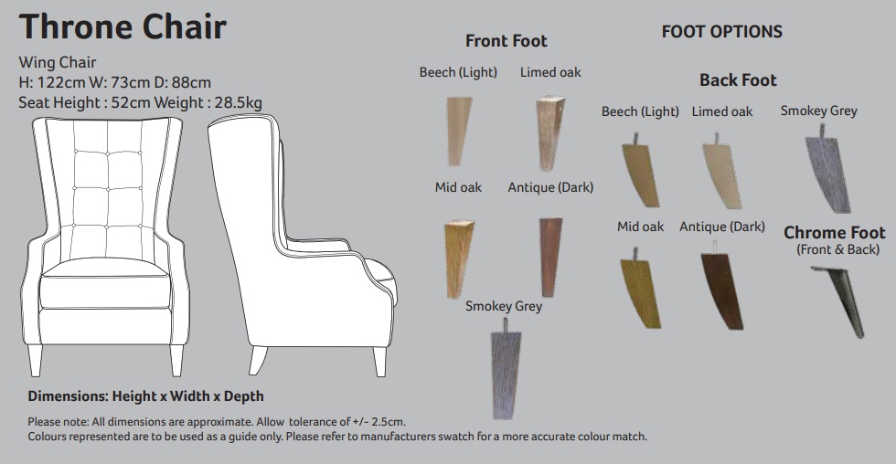 | Foot Options | Antique, Chrome, Beech, Limed Oak, Mid Oak, Smokey Grey |