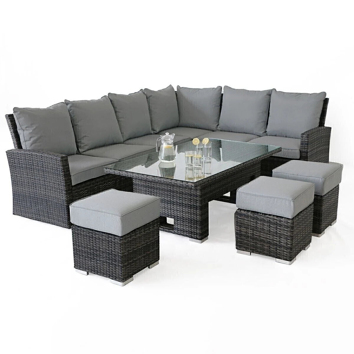 This deluxe brown square Kingston corner dining set by Maze is a new addition to the Kingston casual dining family and is perfectly designed to make the most of your patio this summer with the corner sofa measuring 231cm down each side. Included with this luxurious sofa dining set are 2 rattan benches, a large square corner sofa with deep filled cushions and a square adjustable dining table which can easily be raised from coffee table height up to dining. The brown all weather rattan weave looks perfectly coordinated with the beige showerproof cushions to bring a modern look to your patio.