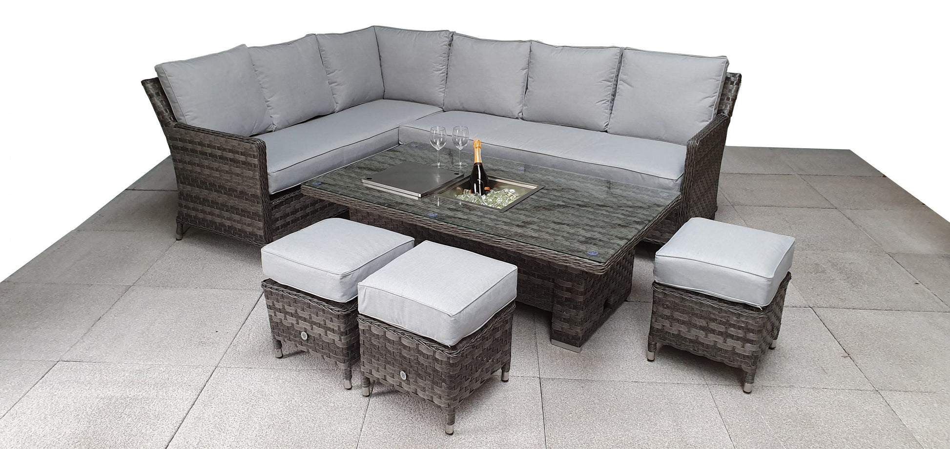 The set includes a spacious rattan corner sofa, a height-adjustable lift table with a built-in ice bucket, and matching padded cushions for ultimate comfort.
