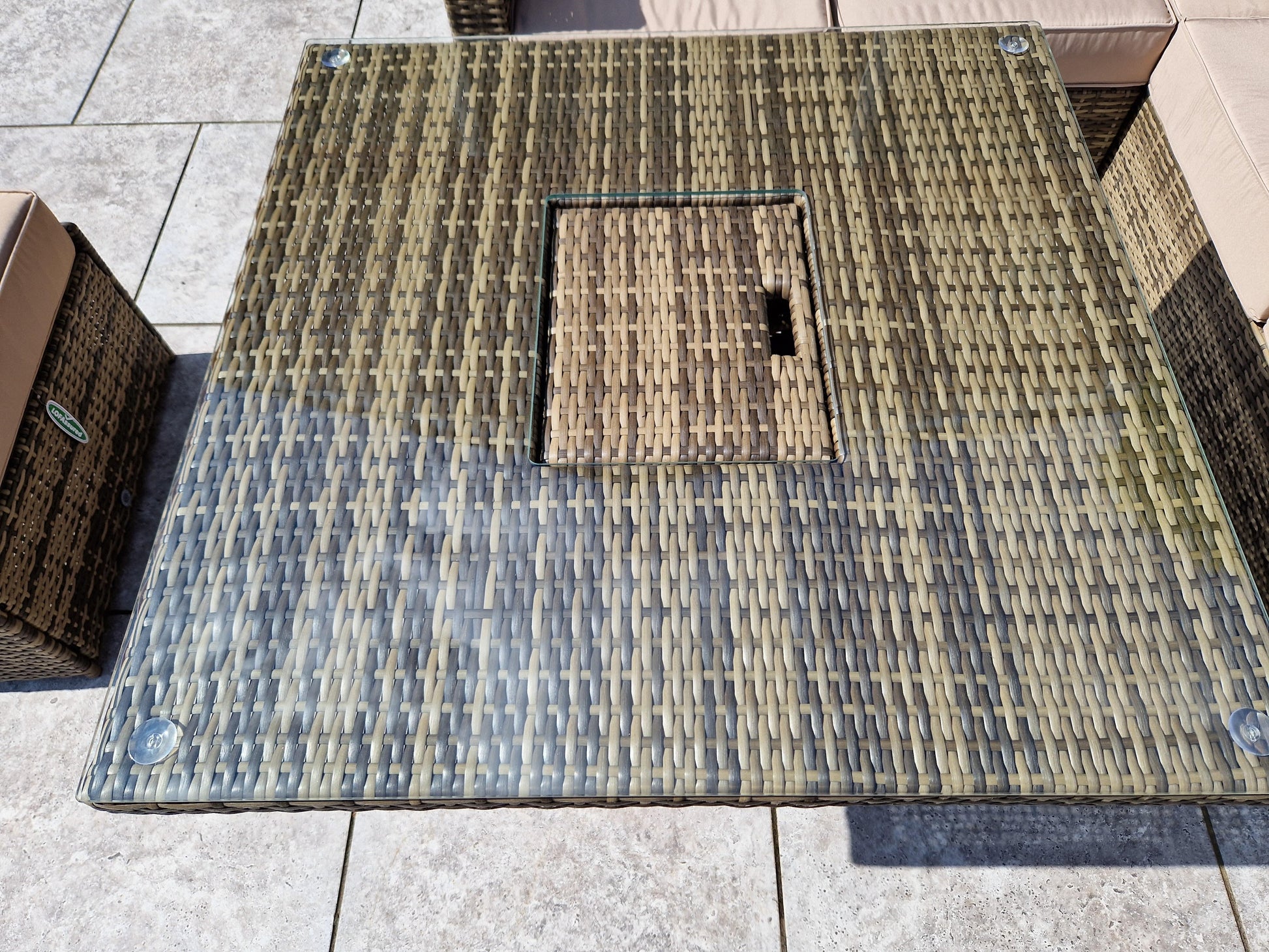 Care Instructions: Cushions should not be left out in the rain as this will cause watermarks. All cushions should be stored away in a dry area when not in use. We do not advise washing or tumble drying as this may affect the FR properties. Do not leave any glass items/objects on the table without mats/coasters. Do not store glass on its end during assembly; please place it on a flat surface on the carton provided. Cover glass in extreme heat as this can magnify the heat and melt wicker.