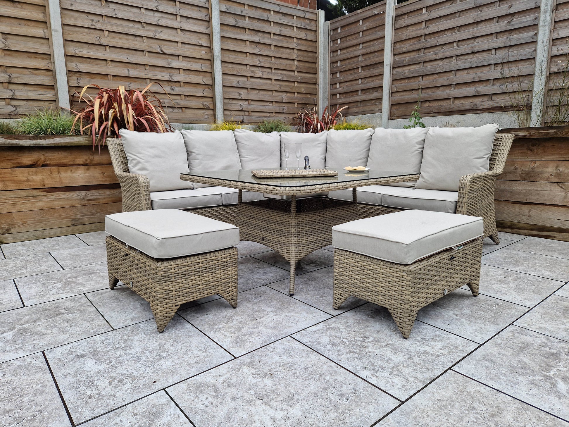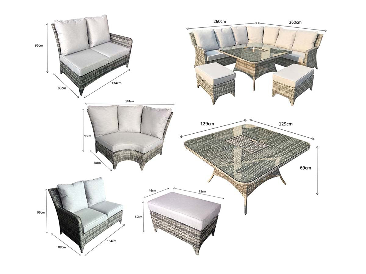 Care Instructions: Cushion covers are showerproof but need to be stood on their ends for water to drain away. All cushions should be stored away in a dry area when not in use. Cushion covers can be cleaned with soapy water and damp cloth that is not abrasive. We do not advise washing or tumble drying as this may affect the showerproof properties. Do not leave any glass items/objects on the table without mats/coasters. Do not store glass on its end during assembly; please place it on a flat surface on the carton provided. Cover glass in extreme heat as this can magnify the heat and melt wicker.