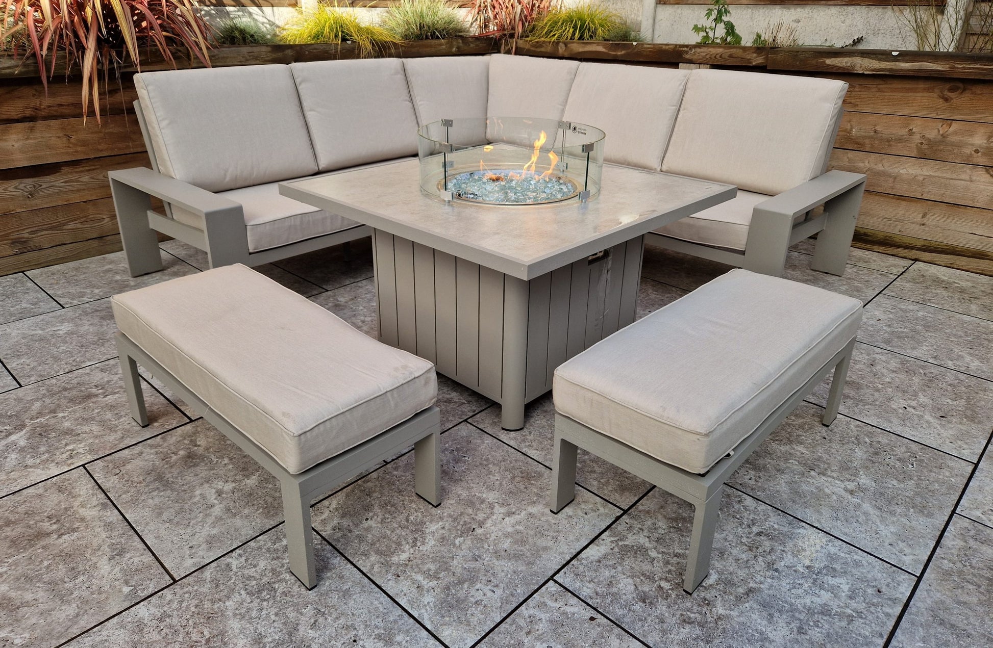 Brand new for 2023 is the Venus Sofa Dining Set, complete with stunning gas fire pit table!
