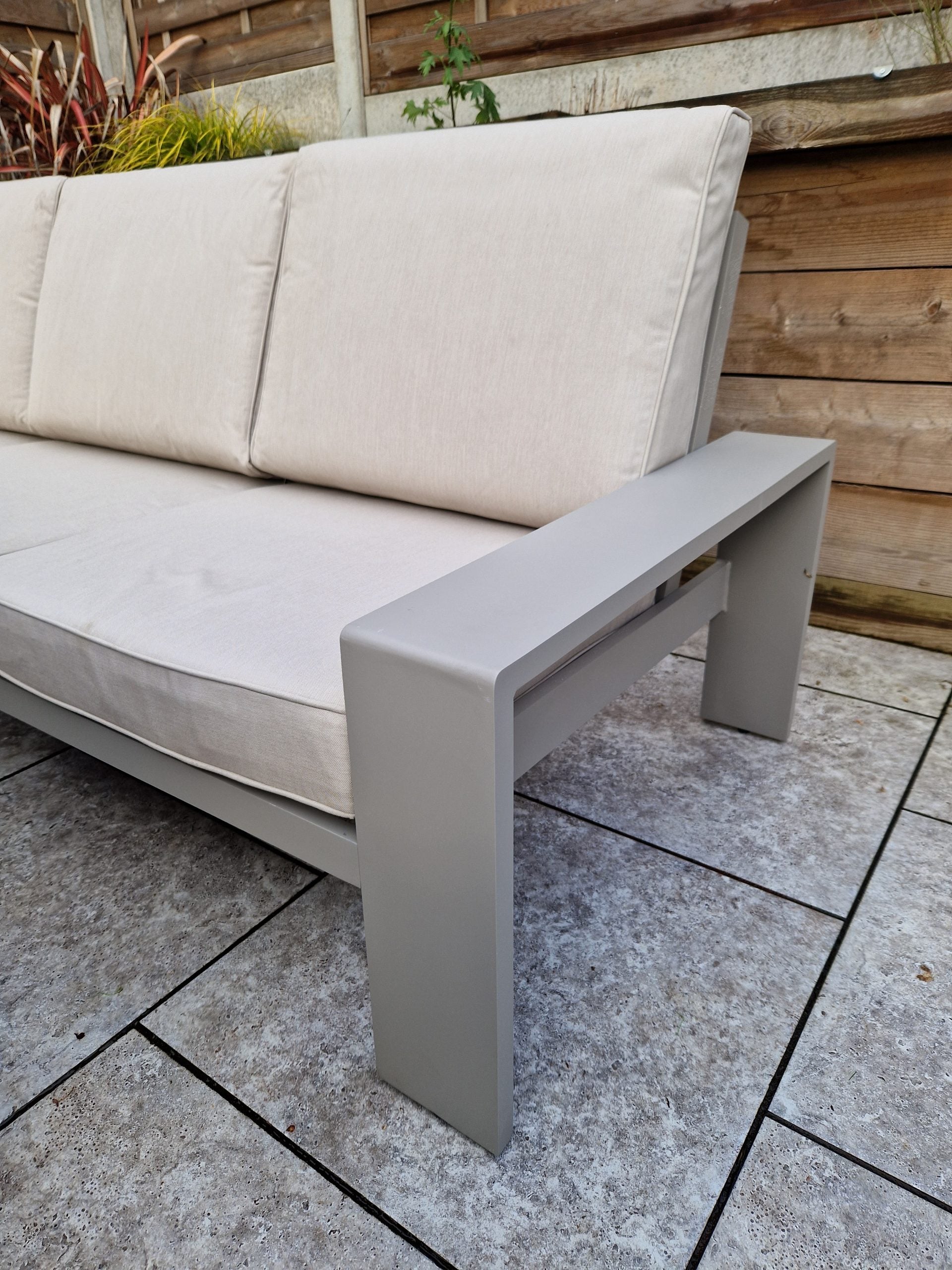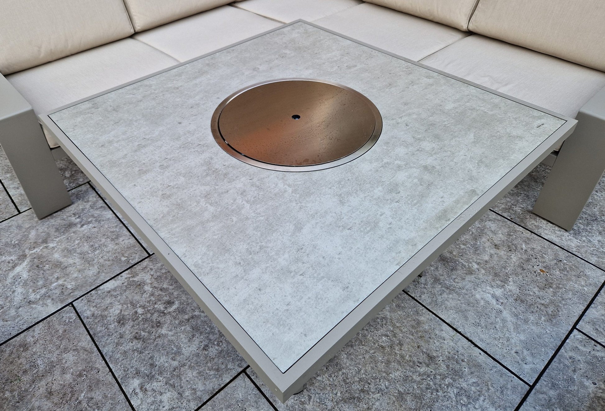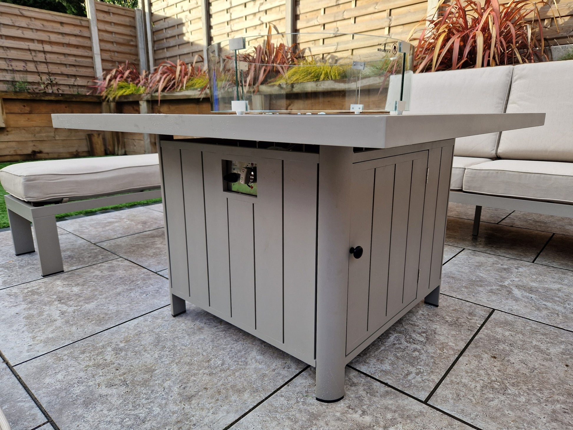 Featuring a modern, sleek, powder coated aluminium frame and pale grey weatherproof cushions to complete the look. Entertain family and friends with enough space for up to 8 people, all whilst keeping warm the whole evening through – and, once the night is over, simply remove the glass surround and cover with the metal panel provided.